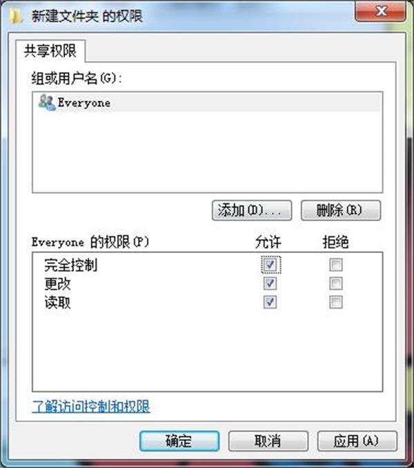 2.点击「属性」中的「高 级共享」,把其「共享此文件夹」选中,并把「Everyone的权限」全部「允许」勾上,点击「应用」;