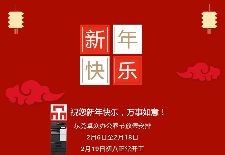 春节是我们中国隆重且蕞有传统特色的节日!春节期间,我们都需要置办年货,包括吃、穿、戴、用、送礼等,俗称年货。为了让卓众信息东莞复印机租赁全员度过一个欢乐、平安的春节,对2021年春节的放假做如下安排: