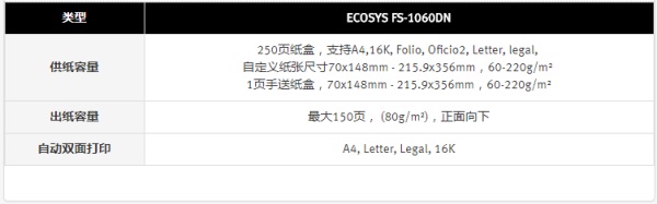4,针对不同文件对纸张的要求,FS-1060DN采用了宽泛的纸张容许度,用纸尺寸70×148mm到A4,纸张重量从60-220g/㎡,并且能够适应用户对一些特殊纸张的需求;标配250张供纸容量,出纸容量最大150页