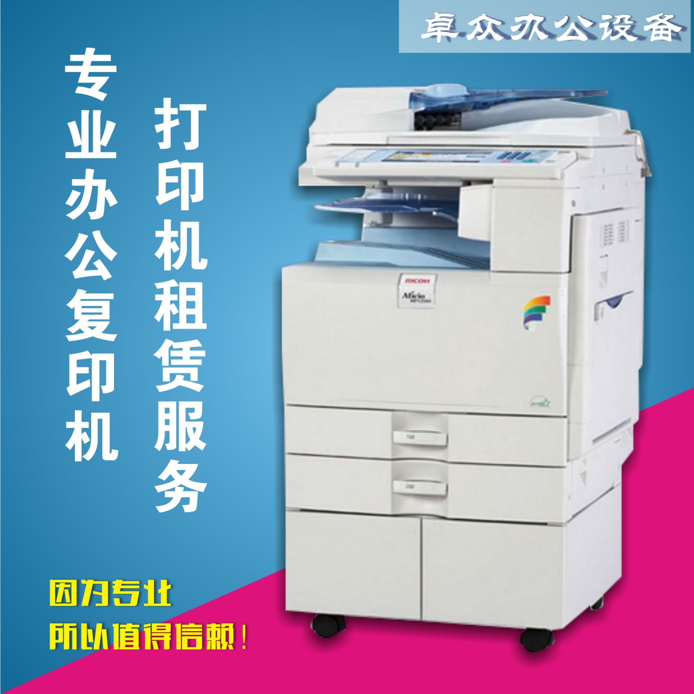 东莞市卓众办公设备有限公司成立于2007年10月,我司主要提供:复印机/打印机/投影仪/绘图仪等多种办公设备销售、维修;专门提供复印机/打印等办公设备租赁服务。是集OA产品、IT产品的销售、维修维护、出租租赁、门禁及网络工程的公司。公司一直坚持“因需而变”的经营理念、“双赢、共赢”的营销准则、“一站式”服务模式。“让客户满意”是我们的职责,我们务求从每个环节严格把关,为客户提供完善的服务。